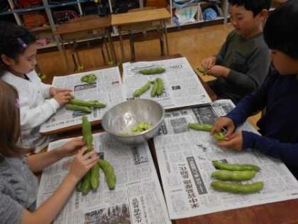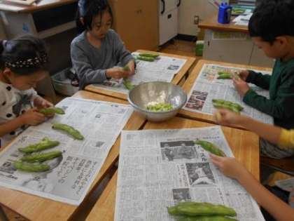 固くてさやを開くのが大変でしたが、一生懸命むきました。