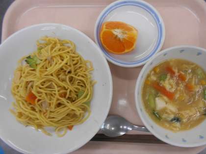 シャンハイ焼きそば、中華コーンスープ、牛乳