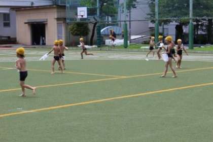 午前中に、にわか雨が降りましたが、3時間目には太陽が顔を出し、1年生が生活科の学習として、校庭で元気に水遊びを楽しみました。