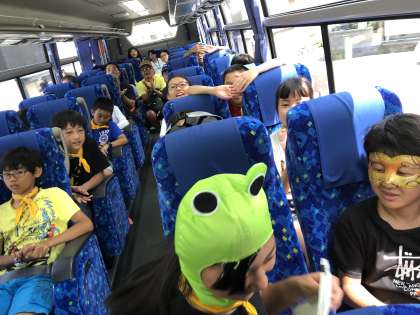 お昼のあとは鴨川シーワールドにお土産を買いに行きます。それまではまたまたバスレクです。