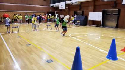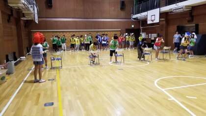 くじを引き、そこに書かれている道具を使ってピンポン玉を運ぶくじ引きリレーをしました。