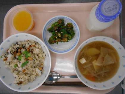 8月29日 大豆とひじきの混ぜご飯 豚汁 オクラのおかか和え オレンジゼリー 牛乳 公開日 2019/08/30 更新日 2019/08/30 給食 8/29 【今日の献立】 ●大豆とひじきの混ぜご飯 ●豚汁 ●オクラのおかか和え ●オレンジゼリー ●牛乳 【食材の産地】 ひじき(長崎)、にんじん(北海道)、いんげん(青森)、オクラ(沖縄)、ごぼう(青森)、大根(北海道)、じゃがいも(北海道)、長ねぎ(新潟)、豚肉(埼玉) いいね(0)