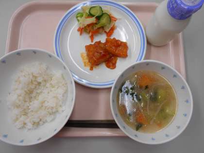8月30日 麦ごはん 中華スープ いかのチリソース 一塩野菜 牛乳 公開日 2019/08/30 更新日 2019/08/30 給食 8/30 【今日の献立】 ●麦ごはん ●中華スープ ●いかのチリソース ●一塩野菜 ●牛乳 【食材の産地】 にんにく(青森)、しょうが(高知)、長ねぎ(新潟)、キャベツ(群馬)、にんじん(北海道)、きゅうり(長野)、玉ねぎ(北海道)、もやし(神奈川)、青梗菜(茨城)、いか(ペルー) いいね(0)