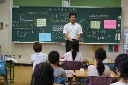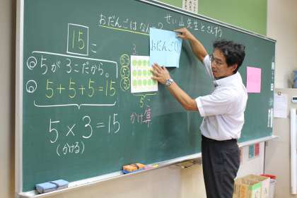 今回は、算数で全国に名を馳せている筑波大学附属小学校の盛山隆雄先生に2年生の「かけ算の導入」の授業をしていただきました。