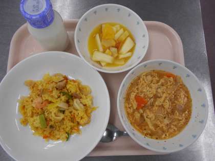 世界の料理(スペイン)です。有名なパエリアは食べたことがある子が多かったです。マチェドニアは、りんご、パイナップル、白桃、みかん、甘夏みかんの5種類のフルーツをに、オレンジ味のシロップをかけました。