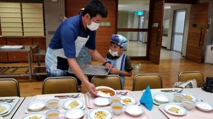 食事当番の児童が一生懸命に準備をしています。