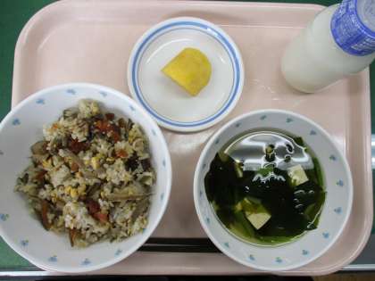 10月3日 さんまのひつまぶし風 すまし汁 柿 牛乳 公開日 2019/10/08 更新日 2019/10/08 給食 10/3 【今日の献立】 ●さんまのひつまぶし風 ●すまし汁 ●柿 ●牛乳 【食材の産地】 ごぼう(青森)、にんじん(北海道)、しょうが(高知)、小松菜(東京)、わかめ(徳島)、たけのこ(福岡)、たまご(栃木)、柿(和歌山) いいね(0)