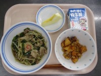 手で直接食品を触らないように、パンは袋に入れて提供しました。低学年にはパンを少しずつ出して食べるのが難しかったようです。徐々に慣れてもらえればと思います。高学年のあるクラスでは、食べ終わった後にパンの袋で折り紙をしていました。ゴミが美しく返ってきたので調理員さんも喜んでいました。