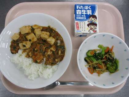 9月30日 麻婆豆腐丼 糸寒天入り中華風サラダ 牛乳 公開日 2020/09/30 更新日 2020/09/30 給食 9/30 ≪献立≫ ●麻婆豆腐丼 ●糸寒天入り中華風サラダ ●牛乳 ≪使用食材・産地≫ しょうが(高知)、にんにく(青森)、にんじん(北海道)、玉ねぎ(北海道)、長ねぎ(青森)、にら(栃木)、にんじん(北海道)、きゅうり(群馬)、小松菜(千葉)、豚ひき肉(熊本) いいね(0)