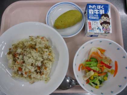 11月20日 鶏ごぼうピラフ カラフルサラダ スイートポテト 牛乳