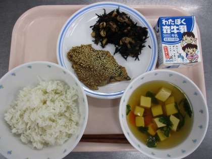 11月24日 麦ごはん さばの利休焼き ひじきの五目煮 卵豆腐のお吸い物 牛乳
