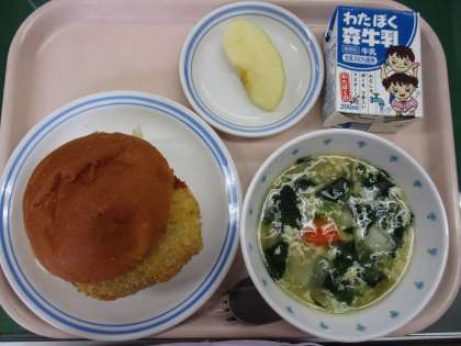 11月25日 コロッケバーガー 野菜とたまごのスープ りんご 牛乳 公開日 2020/11/26 更新日 2020/11/26 給食 11/25 ≪献立≫ ●コロッケバーガー ●野菜とたまごのスープ ●りんご ●牛乳 ≪使用食材・産地≫ 豚ひき肉(熊本)、鶏肉(北海道)、たまご(栃木)、キャベツ(愛知)、玉ねぎ(北海道)、じゃがいも(北海道)、セロリ(静岡)、にんじん(北海道)、白菜(茨城)、ほうれんそう(東京)、りんご(青森) いいね(0)