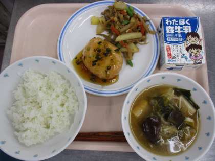 12月1日 ごはん 鮭のつくねバーグ じゃがいもの金平 みそ汁 牛乳