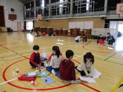 2年生は生活科と国語科で、紙コップや松ぼっくりを使って、おもちゃを作りました。「せっかくだから1年生にも作り方を教えて、一緒に遊んでみたい。」という声が出て、交流をすることになりました。