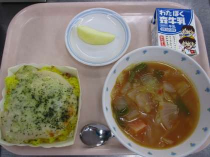 12月22日 ドリア ミネストローネ りんご 牛乳 公開日 2020/12/22 更新日 2020/12/22 給食 12/22 ≪献立≫ ●ドリア ●ミネストローネ ●りんご ●牛乳 ≪使用食材・産地≫ にんじん(千葉)、玉ねぎ(北海道)、パセリ(静岡)、にんにく(青森)、じゃがいも(北海道)、キャベツ(愛知)、ピーマン(茨城)、りんご(岩手)、豚肉(熊本)、鶏肉(北海道) いいね(0)