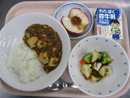 1月15日 麻婆豆腐丼 中華風野菜 焼きりんご 牛乳 公開日 2021/01/15 更新日 2021/01/15 給食 1/15 ≪献立≫ ●麻婆豆腐丼 ●中華風野菜 ●焼きりんご ●牛乳 ≪使用食材・産地≫ りんご(青森)、豚ひき肉(熊本)、しょうが(高知)、にんにく(青森)、にんじん(埼玉)、玉ねぎ(北海道)、長ねぎ(千葉)、にら(栃木)、きゅうり(宮崎)、かぶ(千葉) いいね(0)