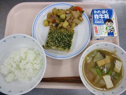 1月26日 ごはん 松風焼き 変わり五目豆 みそ汁 牛乳