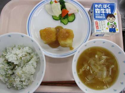2月1日 青のりごはん 揚げだし豆腐 即席漬け みそ汁 牛乳 公開日 2021/02/01 更新日 2021/02/01 給食 2/1 ≪献立≫ ●青のりごはん ●揚げだし豆腐 ●即席漬け ●みそ汁 ●牛乳 ≪使用食材・産地≫ 大根(神奈川)、きゅうり(宮崎)、にんじん(千葉)、かぶ(千葉)、しょうが(高知)、じゃがいも(北海道)、玉ねぎ(北海道)、えのき(新潟) いいね(0)
