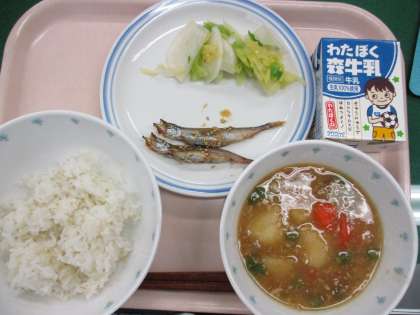 2月15日 麦ごはん じゃがいものそぼろ煮 焼きししゃものごまだれ 一塩野菜 牛乳