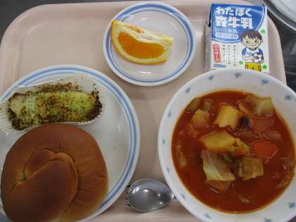 2月24日 黒砂糖パン 真鯛のパン粉焼き ボルシチ いよかん 牛乳