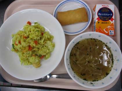 3月8日 えびカレーピラフ 鮭とチーズの包み揚げ オニオンスープ オレンジジュース