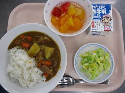 カレーライスの肉はいつもは薄切り肉を使用していますが、今回は特別に豚の角切り肉を使いました。給食室でやわらかく煮込んだのでとてもおいしいカレーになりました。
