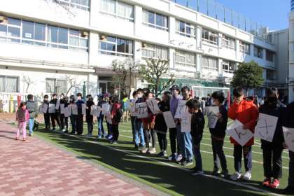 6年生みんなで、メッセージを掲げ、