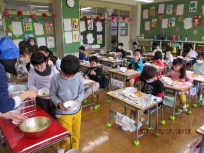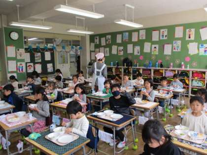 小学生になって初めての給食を食べました。給食の前に、6年生が動画で配膳の仕方、片付けの仕方を教えてくれました。これから毎日、菅刈小学校の美味しい給食を食べられることが嬉しいですね!