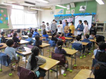 入学式の日から、毎日6年生が1年生のお世話をしに来てくれています。読み聞かせ、ゲーム、朝や帰りの支度のお手伝い、1年生が下校した後の教室の掃除など、様々な場面で、1年生の初めての学校生活をサポートしてくれています。