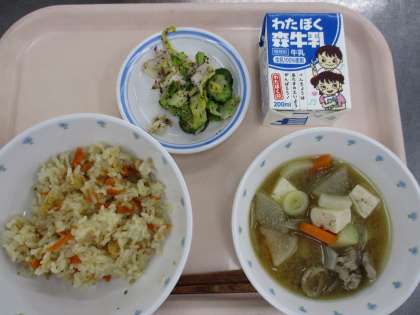 4月15日 こぎつねおこわ 豚汁 野菜のゆかり和え 牛乳