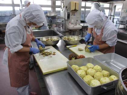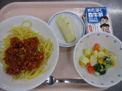 ヘルシーミートソースは豚ひき肉の量を少し減らし、大豆のみじん切りを入れて作りました。おいしさをそのままに、大豆の栄養がとれます。果物は沖縄県産のピーチパインです。小さく、実が白い色のパイナップルです。桃の香りに似ているのでピーチパインと言うそうです。