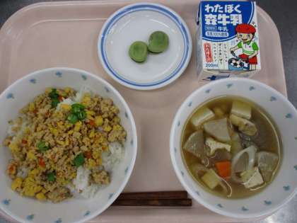 5月10日 ヘルシーそぼろ丼 けんちん汁 ゆでそら豆 牛乳