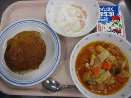 5月18日 小松菜とチーズのパン ミネストローネ フルーツヨーグルト 牛乳