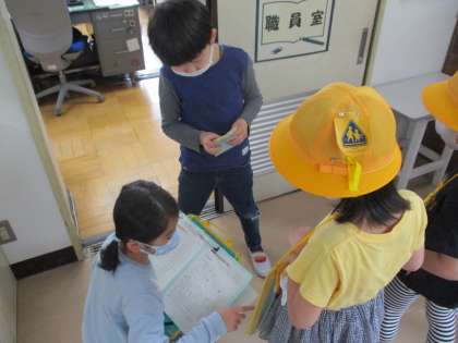 今日は1年生と一緒に学校探検をしました。今年は2年生として、1年生に学校のことを教えてあげる立場です。今日のために、たくさんの準備をしてきました。