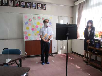 緊急事態宣言中なので、校長室から各教室へリモート配信する方法で行いました。