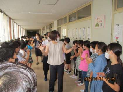 離任式の後は、離任された方々に校内を歩いていただき、直接お顔を見ることができました。ハイタッチなどはしないという約束を守り、しっかりとお見送りをしました。
