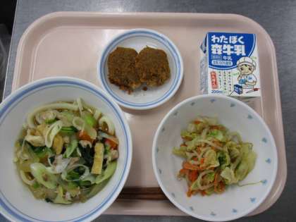 6月16日 五目うどん ごま酢和え 黒糖くずもち 牛乳