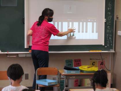 1年生の音楽の授業で、iPadを使いました。卵をやさしく持っているような手の形でiPadの鍵盤を弾いてみました。やさしい音でドレミと音を出しました。