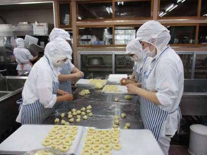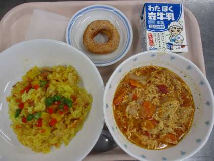 世界の料理でスペインのパエリア、ソパデアホ、ロスキートスを作りました。ソパデアホの「ソパ」はスープ、「アホ」はにんにくのことです。にんにくをきかせたトマトスープです。ロスキートスはレモンの皮入りのドーナツです。シナモンシュガーをまぶしました。