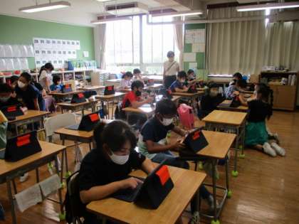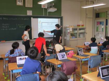 4年生は学校の良いところを班ごとにみつけて、iPadのスライドを使ってまとめています。文字の大きさや色やレイアウトを、見やすい物にしようと工夫していました。