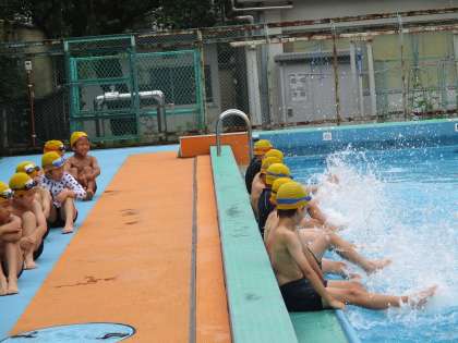 初めての水泳学習は少し寒くて冷たいプールでしたが、「みんなで一緒に入ると楽しかった!」「水の中を歩くのが楽しかった!」「水に顔を付けることができた!」などの感想もたくさん聞こえました。少しずつ、できることを増やしていき、楽しい水泳学習を進めていきたいと思います。