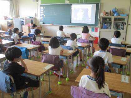 今日の朝会はクラスルームを使って、オンラインで行いました。校長先生から、新しくなった校旗の紹介がありました。今までの校旗は古くなり、傷みが激しかったので、PTAが寄贈してくださいました。大切に使います。その後、夏休み前の荷物に持ち帰りについて、二人の先生方が劇のようにわかりやすく話してくれました。教室の子どもたちは、真剣に聞いていました。今週も元気に落ち着いて生活しましょう。