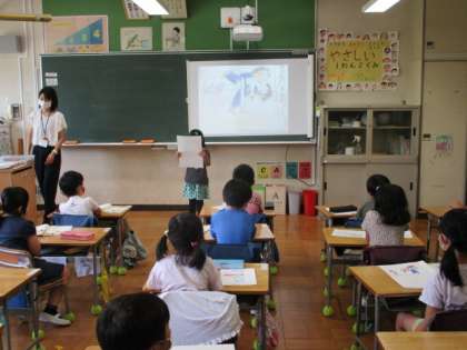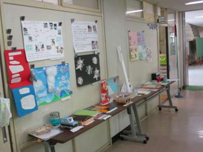 夏休みの期間中に取り組んだ課題を、様々な形で発表し合っていました。左の写真は、情報端末を使って絵日記の発表をしている1年生です。絵を大きくして見られるので迫力があります。右の写真は、自由研究を廊下前に展示した様子です。どの作品も力作で、時間を忘れて見入ってしまいます。