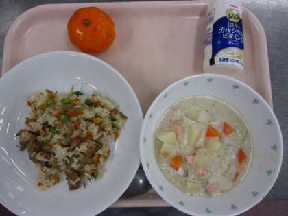 8月27日 鶏ごぼうピラフ サーモンチャウダー 冷凍みかん 牛乳