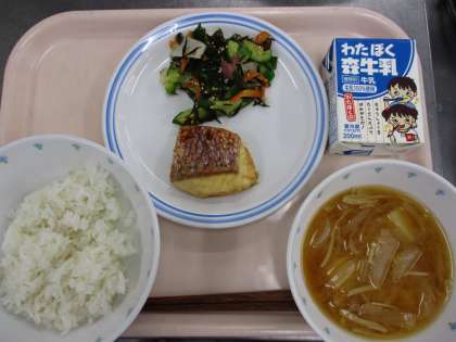 9月7日 麦ごはん 真鯛のガーリックソース 海藻サラダ じゃがいもと玉ねぎのみそ汁 牛乳