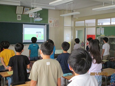 今日の音楽朝会では、それぞれの教室で動画をみてもらいました。