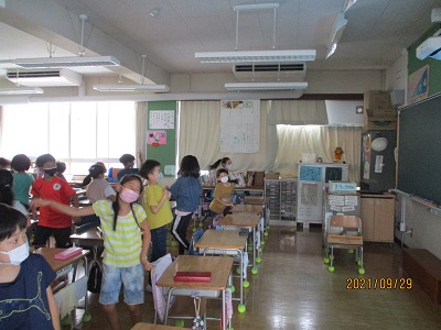 拍にのって各学年返事をしたり、「さんぽ」の曲に合わせてその場足踏みをしたりしました。教室から、大きな返事の声が聞こえました。また、足踏みの途中では音程や速度の変化がありましたが、みんなよく聴いて上手に表現できました。