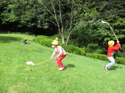 広い芝生の中を、夢中になって虫探しをしている子ども達。