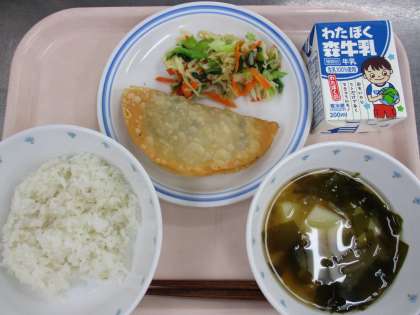 10月11日 麦ごはん ジャンボ揚げ餃子 切干大根のサラダ じゃが芋とわかめのみそ汁 牛乳
