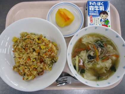 10月21日 キムチチャーハン ワンタンスープ 柿 牛乳
